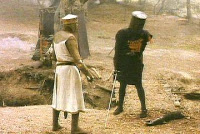 One thing leads to another, swords are drawn, and a duel ensues. Arthur bests the Black Knight, severing limb after limb, the knight’s body spouting out fake blood. The whole battle is ridiculous. But the Black Knight exclaims, “I’m invincible!” To which Arthur replies, “You’re a loony,” and continues to hack away at the Black Knight.