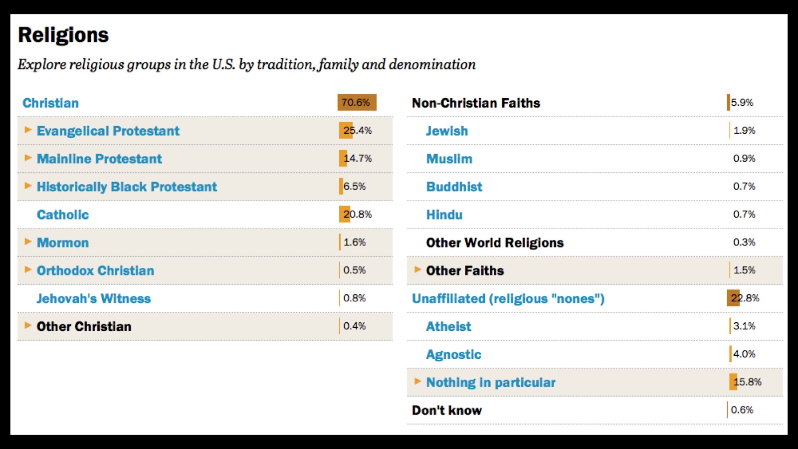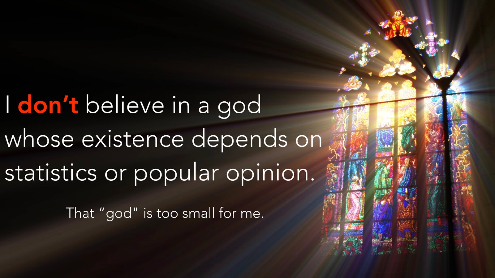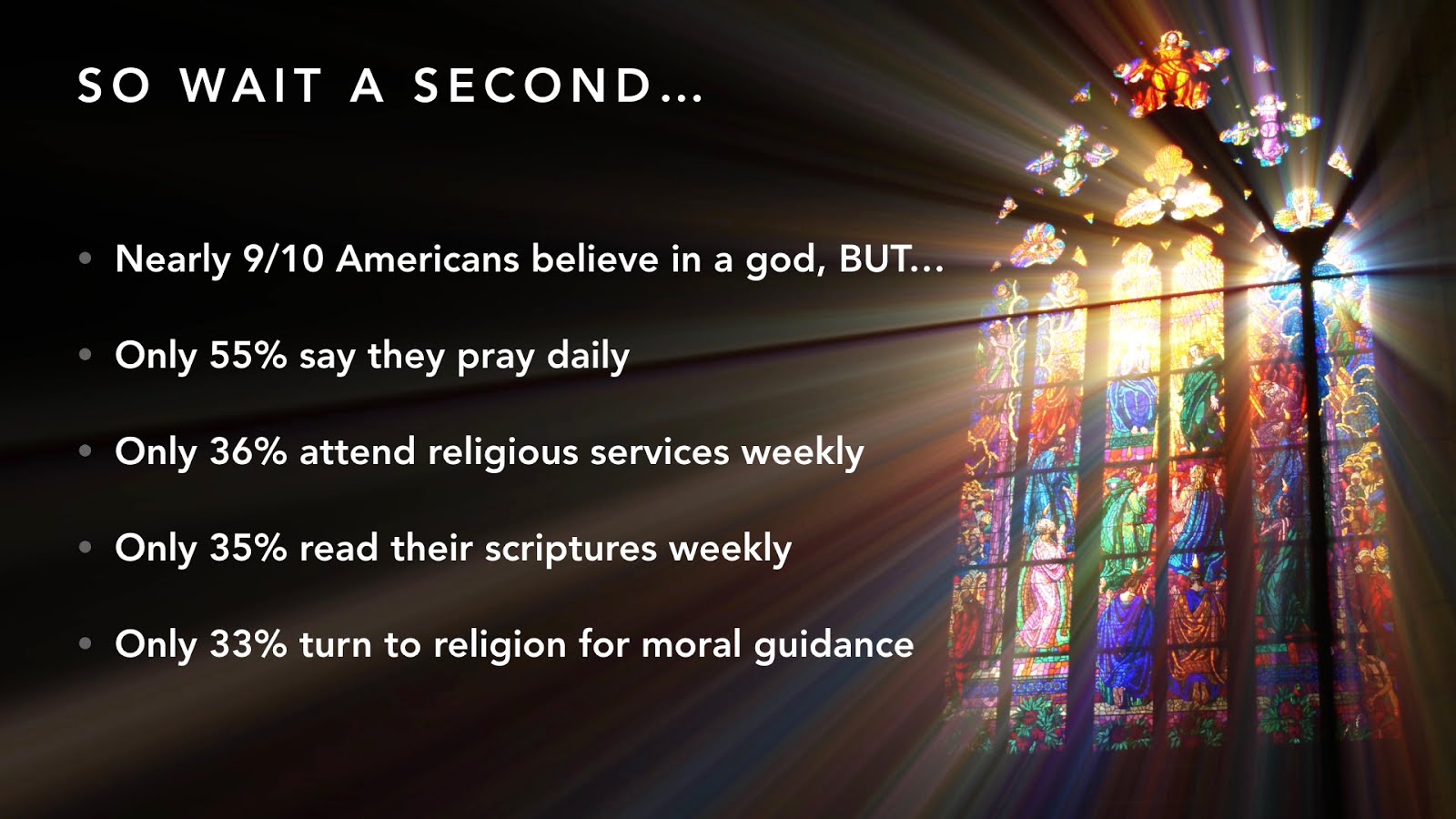 We began a new series last night with the teens called “The God I *Don’t* Believe In.” This fall we will be trying to answer the big questions about God, reality, our place in this world, why things are so broken, what hope there is for the future, and more. For our first couple sessions we will be laying the groundwork for everything to come. We began last night by taking a look at the state of religion in the US. You can click the icon below to listen to an audio recording of our class, and follow along with the presentation notes and videos below.