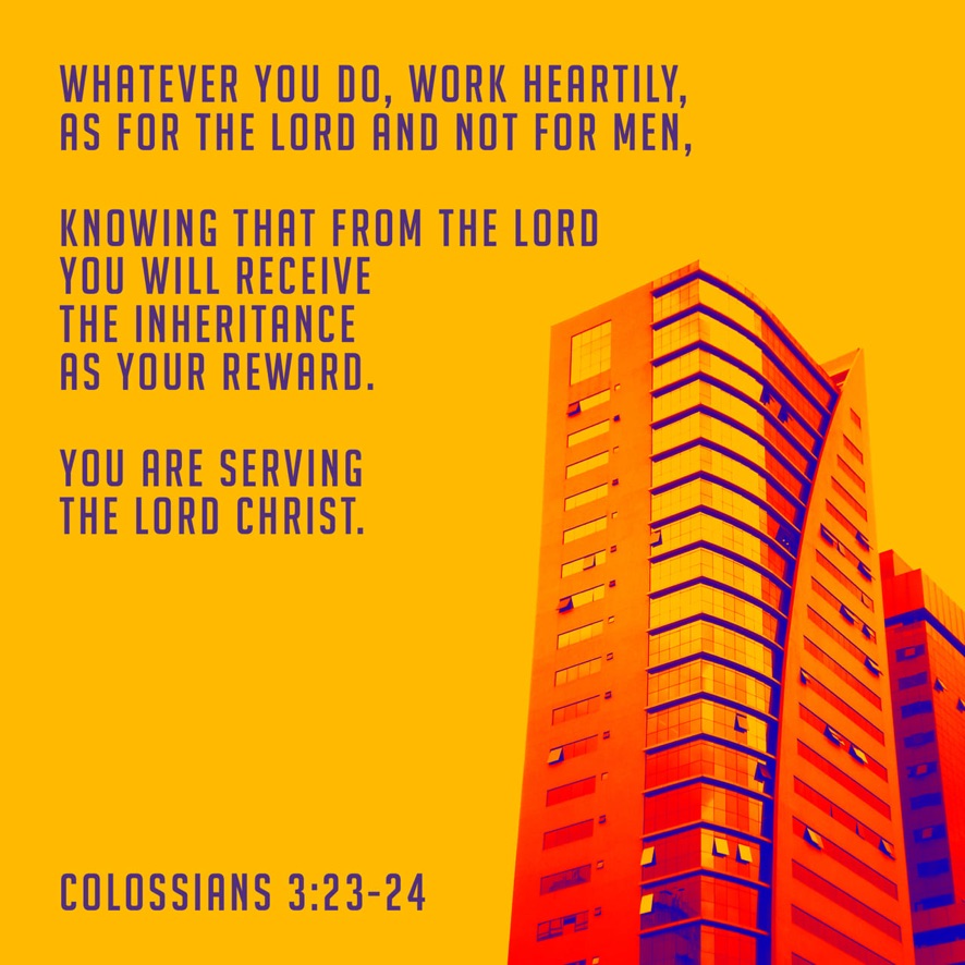 Whatever you do, work at it with all your heart, as working for the Lord, not for human masters, since you know that you will receive an inheritance from the Lord as a reward. It is the Lord Christ you are serving.