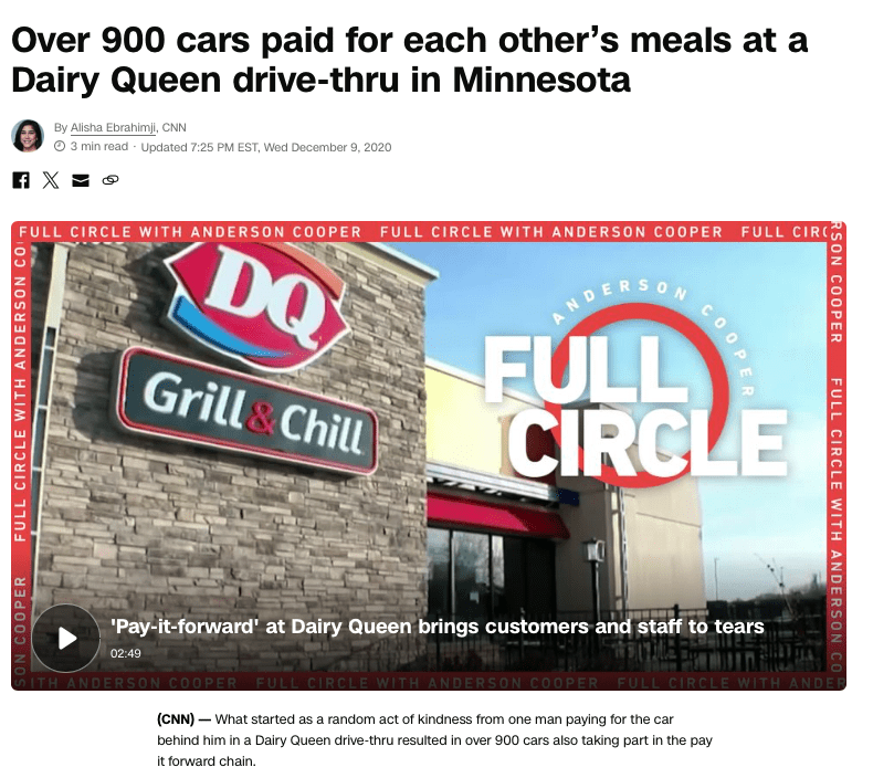 During COVID, when dining rooms were closed, a Dairy Queen in Minnesota experienced this ripple effect firsthand. One customer decided to pay for the car behind them. That simple gesture sparked a chain reaction lasting over 900 cars and generating $10,000 in “pay-it-forward” sales.