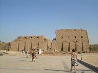 Note on Egyptian Temples: All Egyptian style temples follow the same basic pattern. The have some sort of gateway (pylons) leading into an open court where commoners could enter and worship. Then another gateway leads to a half-opened pillared section where only priests could go. After that there was an area with several vestibules where the idol of the god was brought to “eat” and to be washed and clothed. At the heart of the Temple lies the “Holy of Holies” as our guide called it. This is where the god would live. This was where the idol was kept, along with an “ark” which housed the 14 commandments of Egyptian law.